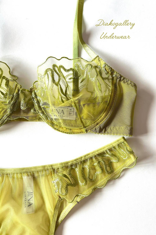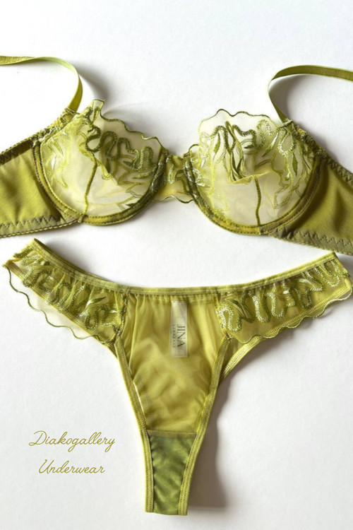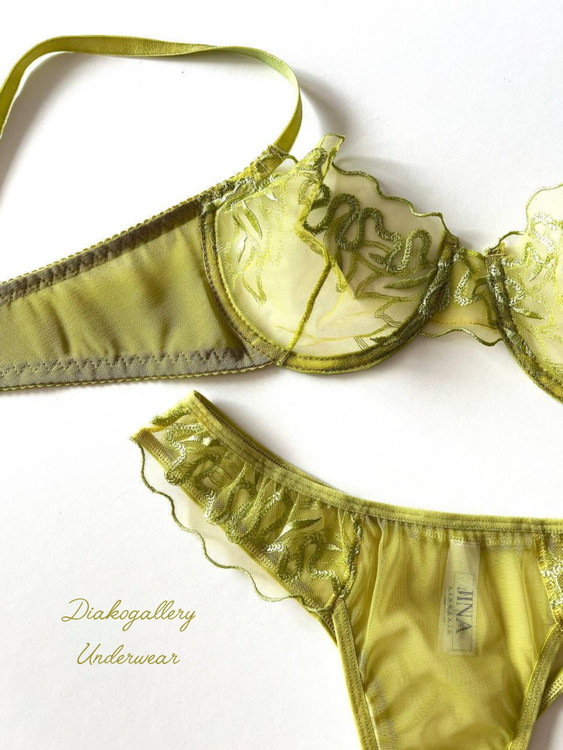 ست سوتین فنردار دانتل با شورت لامبادا سبز زیتونی