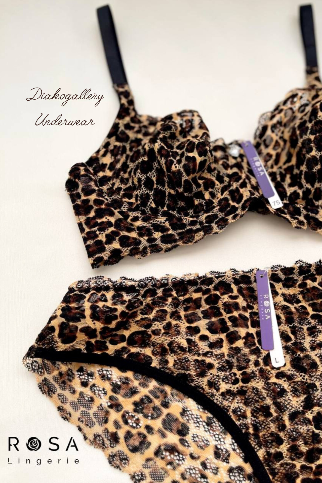 ست پلنگی رزا شامل سوتین دانتل کشی زیر فنردار و شورت اسلیپ با فاق نخی، مناسب استفاده روزانه در سایزبندی ۷۵ تا ۹۰ از کاپ B و قواره استاندارد ایرانی میباشد. سایز شورت از مدیوم تا دو ایکس لارج متناسب با قواره سوتین مناسب ۳۶/۳۸ تا ۴۴/۴۶ میباشد.